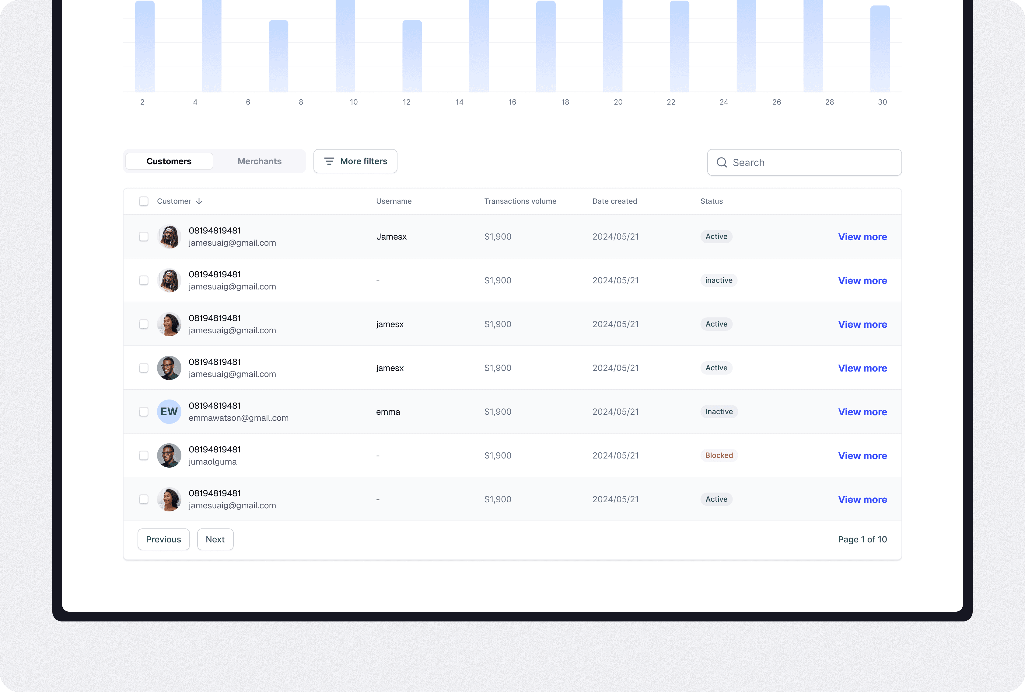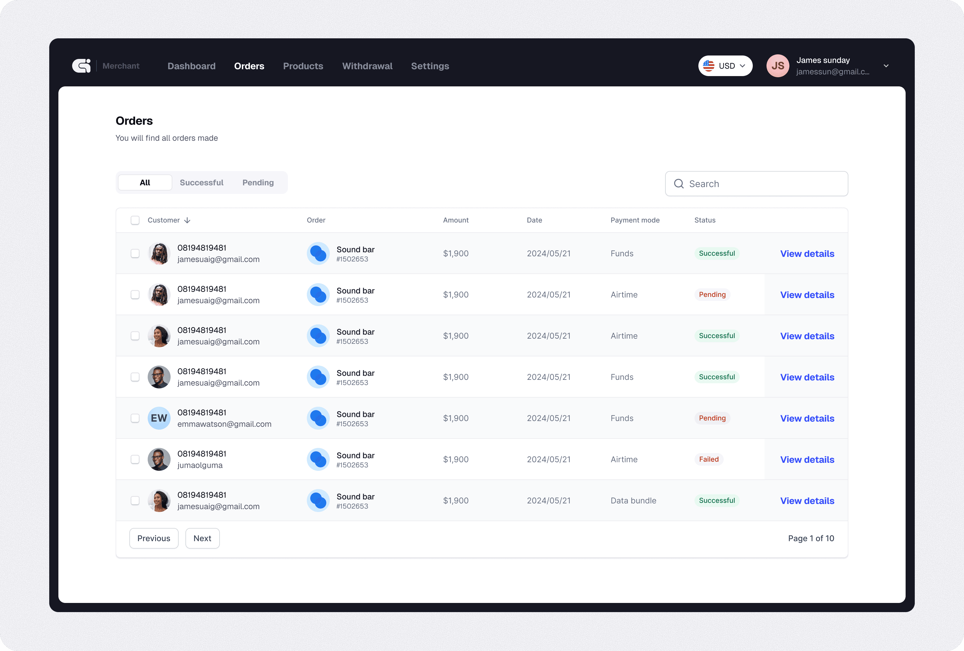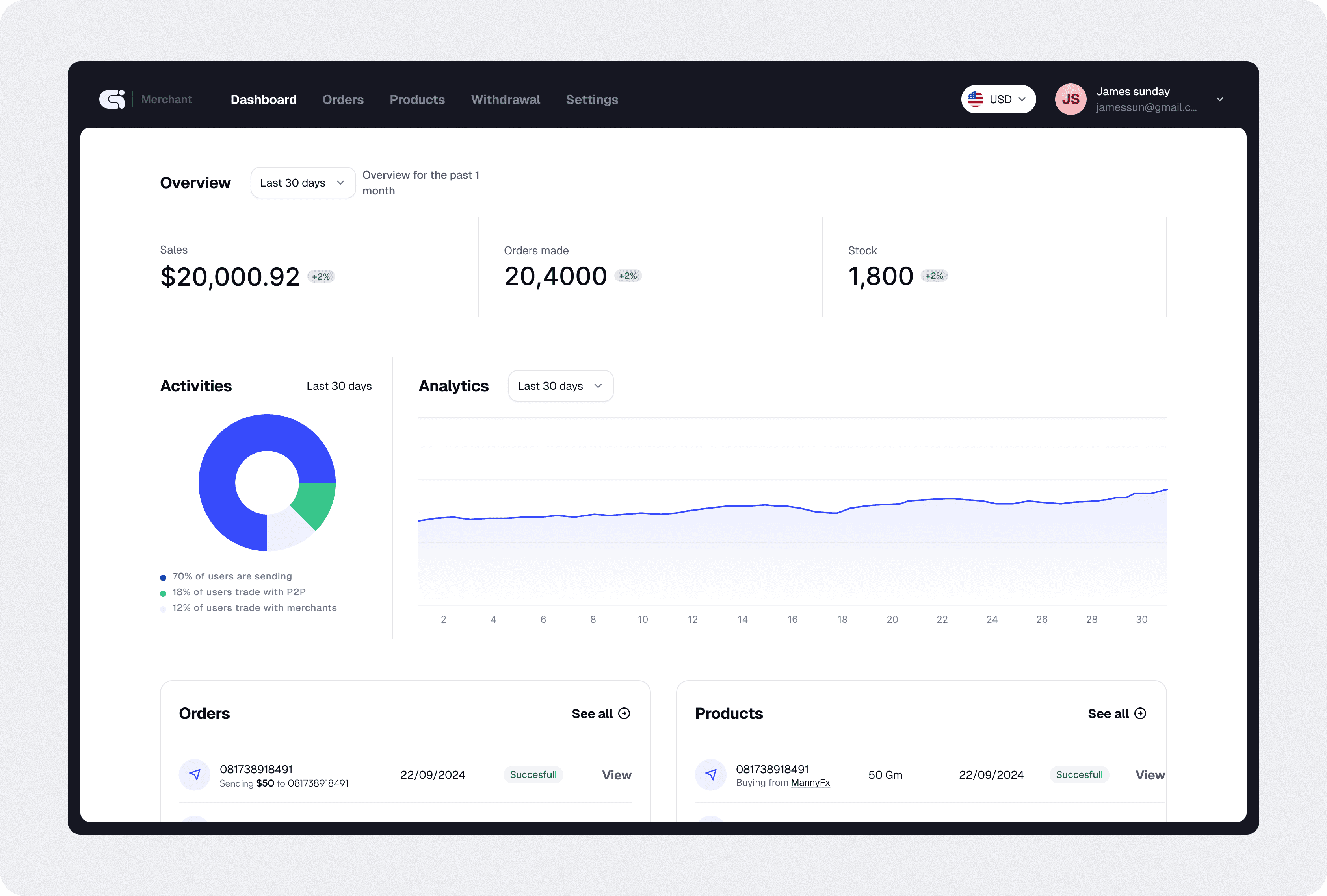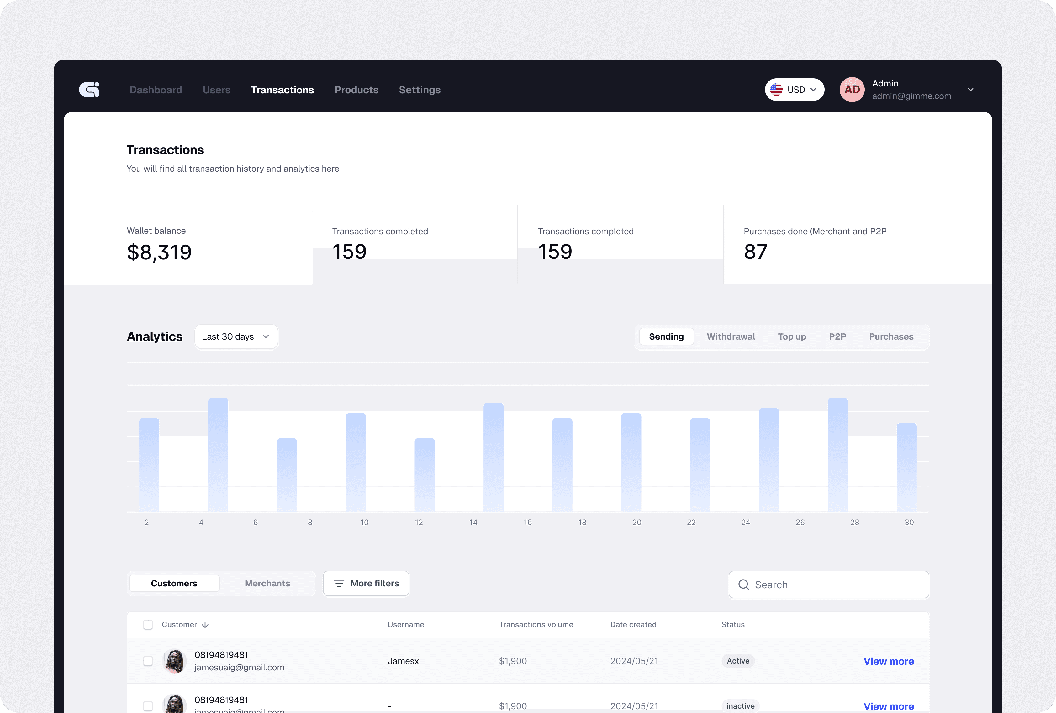Designed to help the system manager oversee everything, with detailed information about both users and merchants