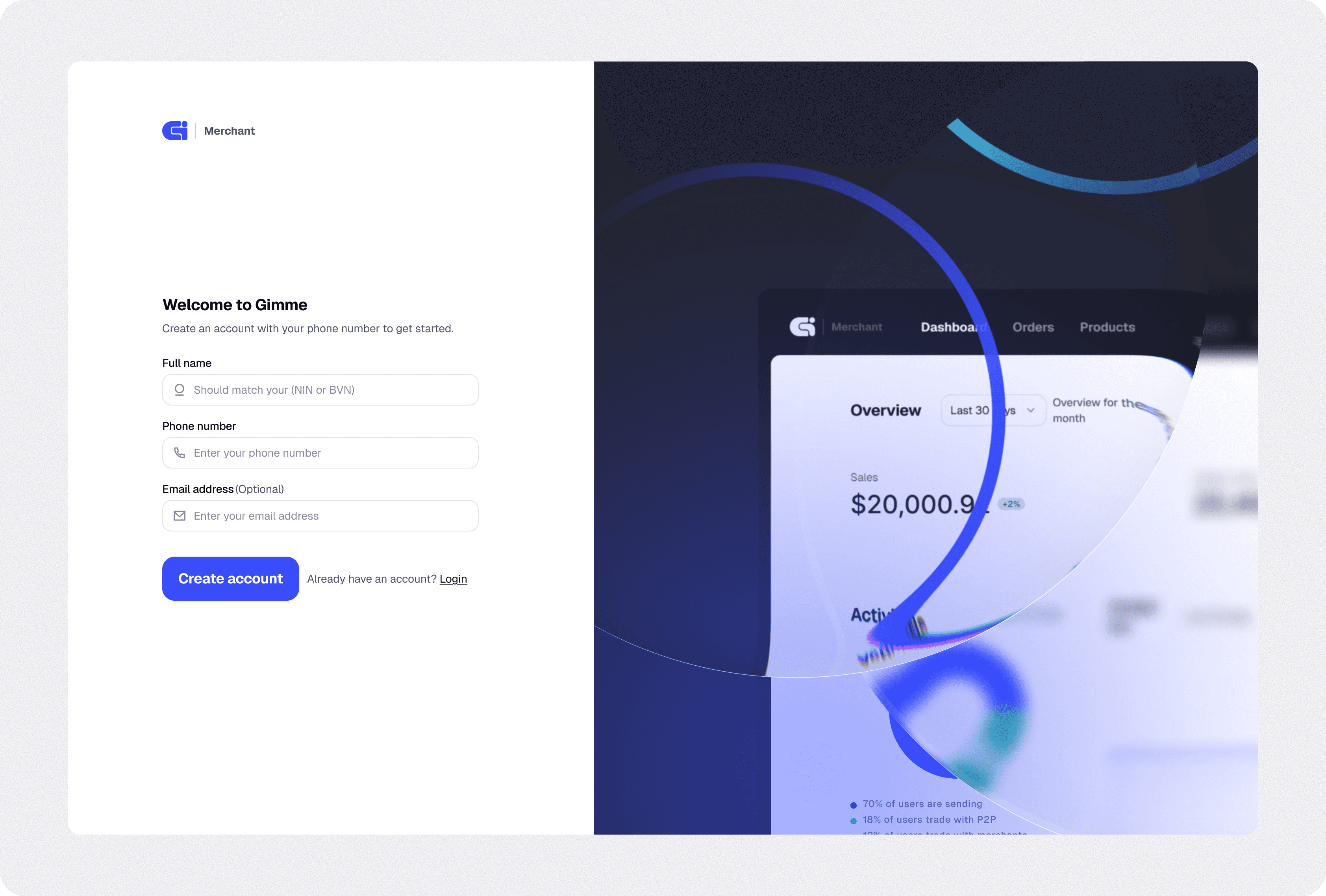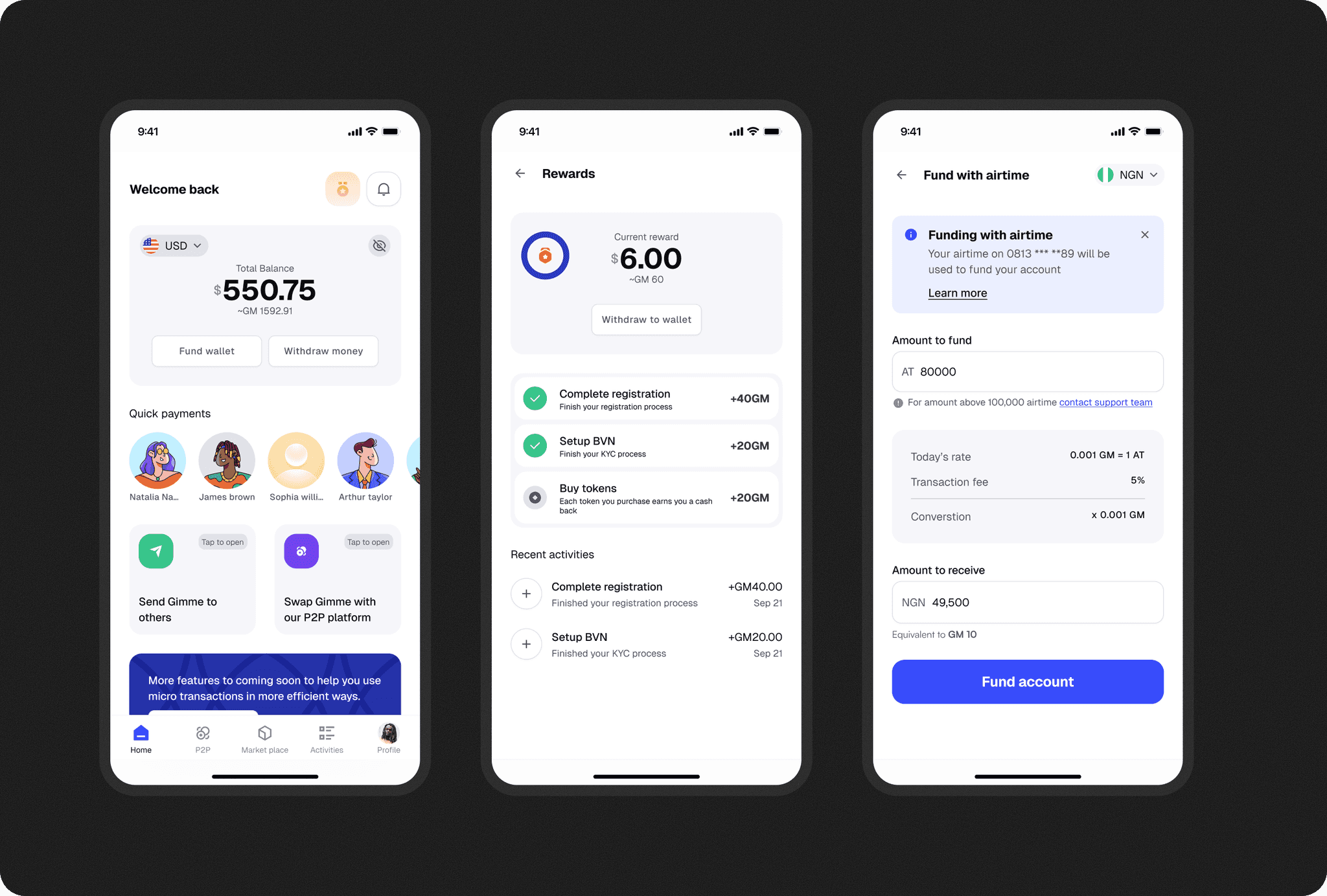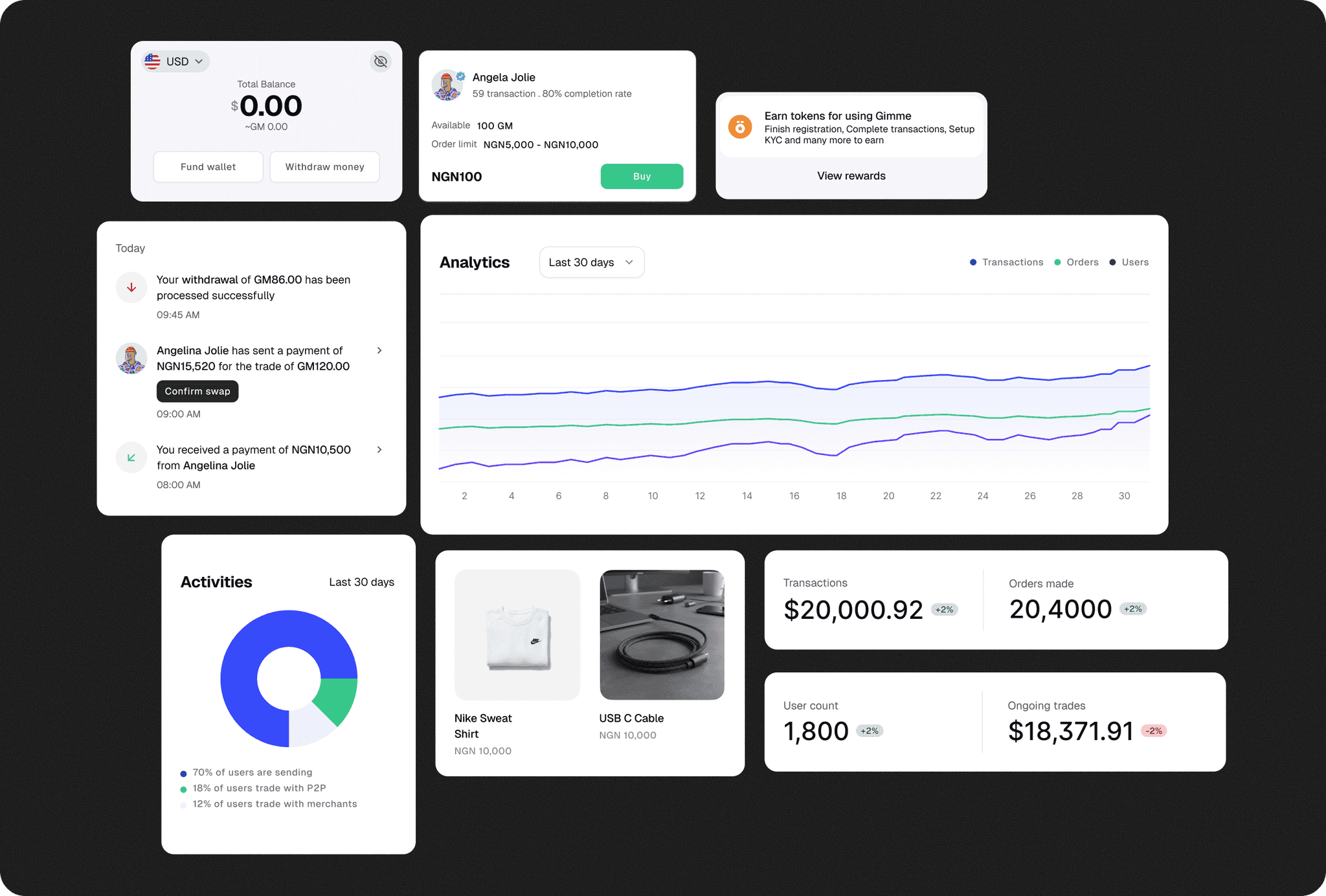 Gimme is a product connecting end users with merchants through a mobile-first experience built on the blockchain, supported by operational dashboards for both users and merchants.